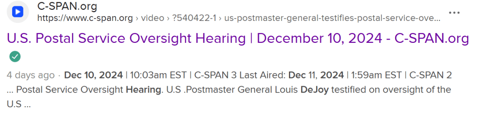 There is no available public information about committee vote deadlocks that stall things like a meaningful hearing with DeJoy BEFORE the election (to ask him why, for example, he refused the IG’s request to post mark mail-in ballots the day they are received or segregate mail-in ballots from the millions of other undelivered letters in the weeks leading up to the 2024 election) or why, and how (and by whom, Kyrsten Sinema?) the confirmation of any of Biden’s three picks for vacant USPS board of directors positions was stonewalled until Trump won the election?