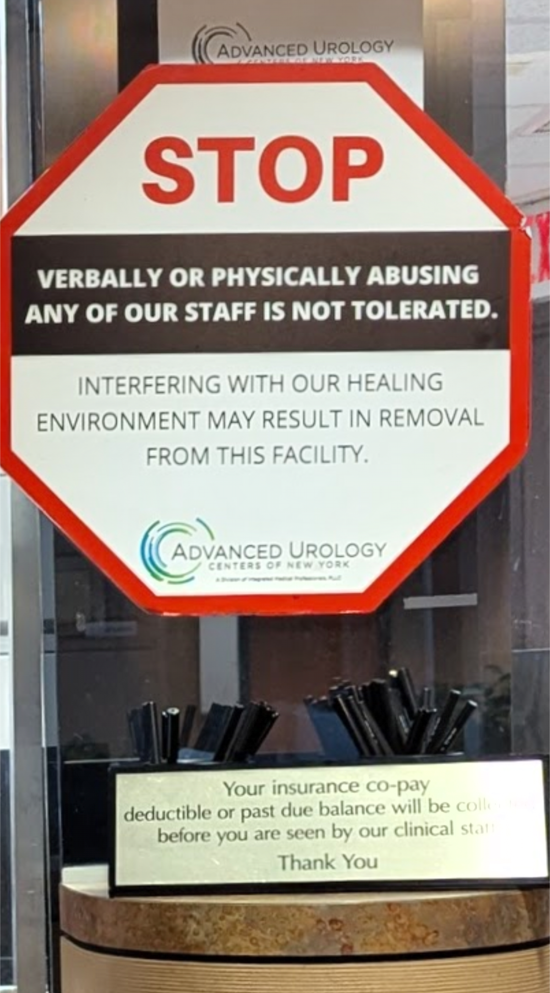 Even if the signs are as clear as this one, in the lobby of my psychopathic former urologist’s office. In fairness to him, his office is part of the nation’s largest network of corporately owned humane, caring, supportive, patient-centered urology practices in the United States. The Supreme Court-created corporate person is a psychopath since it is only obliged to make the most money for shareholders and minimize liability for harm it does in pursuit of profit by any means necessary. Though my sloppy former doctor is the top dog in his office, I guess the “boss” made him put the sign up, they probably have one in each of their hundreds, if not thousands, of compassionate healing centers nationwide.