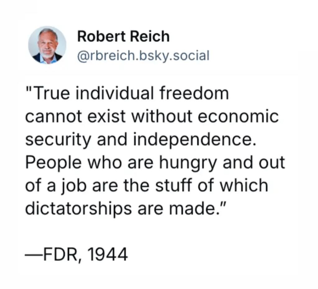 This is the reason Project 2025, Koch, Heritage, the Federalist Society, et al (really all the same entity), need to turn up the heat on ordinary American citizens, make them hungrier, more insecure and out of work. Publicly, brazenly terrorizing innocent “illegals”, and roughing up opposition elected officials (without consequence) is a great way to increase general fear and outrage. Have masked ICE agents spray a landscaper with mace, tackle and repeatedly punch him once he’s in handcuffs, let his US Marine sons make their pleas on social media — the thirty year resident of the US, a taxpayer, is going to Sudan, Louisiana, Texas or maybe Alligator Auschwitz.