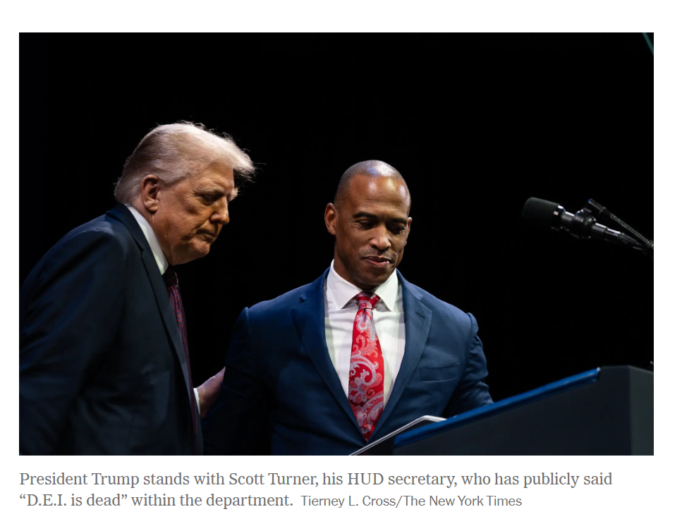 HUD Secretary Scott Turner apparently believes, along with Trump, the Heritage Foundation, Charles Koch, Elon Musk, Peter Thiel, Jared Kushner and MAGA world (not to mention the Ku Klux Klan), that Diversity, Equity and Inclusion is a sickness, like the vaguely defined yet highly contagious “woke mind virus”, that must be eradicated. DEI, we are told, is an anti-American commie myth perpetrated to place unqualified inferior non-white, non-male people in power to bring down White America. To believe this requires a few leaps of faith, or leaps of idiocy.