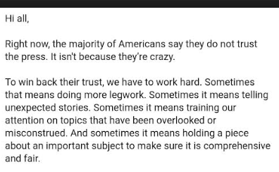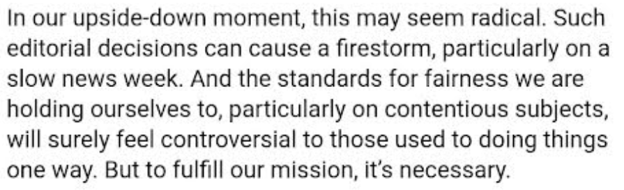 Our mission? Media monopoly, owned by oligarchs, promoting curated “news” supportive of the regime’s policy goals to implement permanent one party, totalitarian rule? Hmmm, I guess that tracks. It may indeed seem radical, on a slow news week when nothing of great national consequence is happening, to kill a carefully vetted story damaging to the fulfillment of their mission.