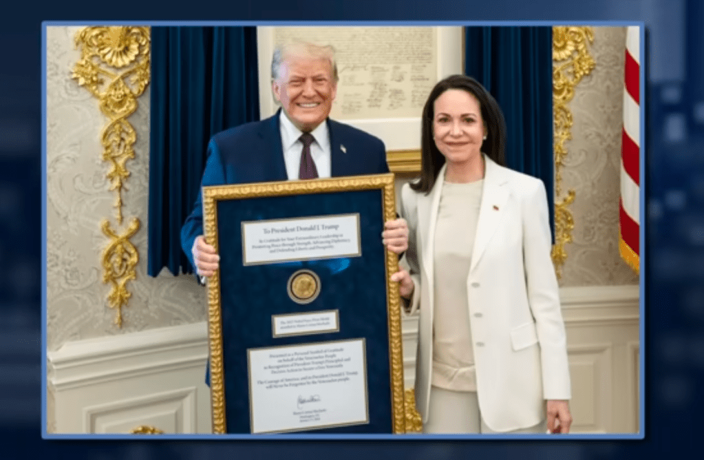 The world’s greatest winner, shown here beaming, after solving 75 major international wars and being unfairly deprived of his rightful Nobel Peace prize, shaking down the winner of this year’s peace prize for her prize, which he now claims for himself.