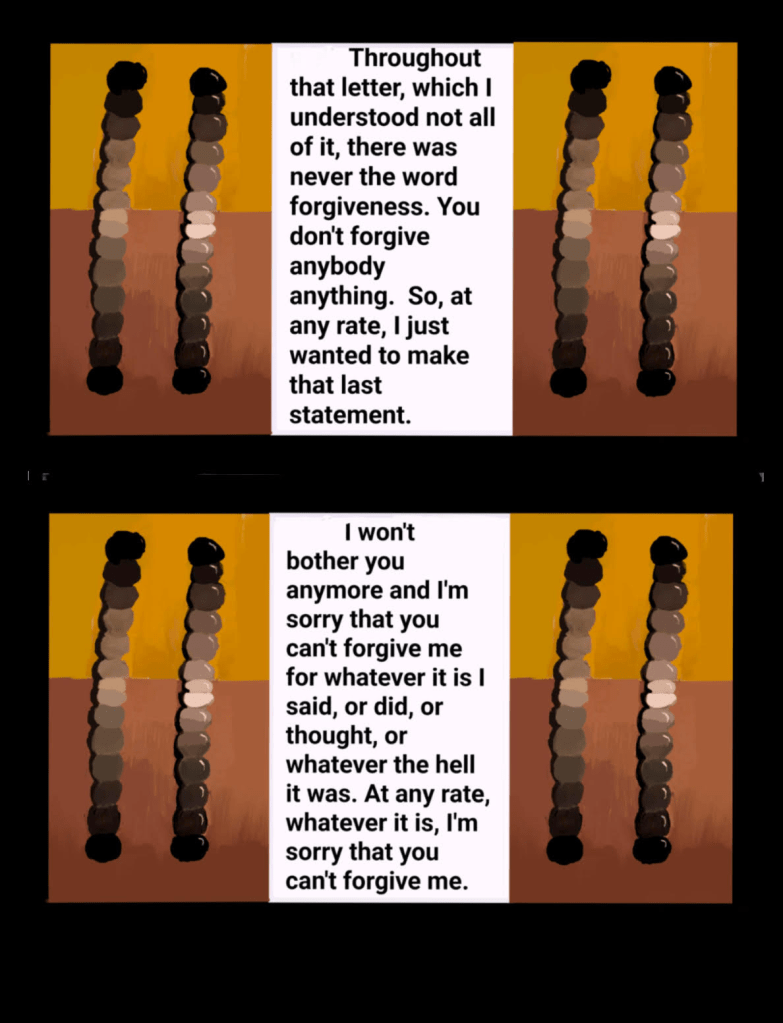 In the end I did the only thing possible in the face of an insistence on an insane worldview. After hearing the same insane insistence that I must forgive even people incapable of regret, empathy or apology, I stopped taking her calls and wrote her a note which I put in the mail. Her response was a classic, a close variation on the one you will always get from someone who insists incoherence by way of the last word is simply fine and dandy and there will be no further discussion of the matter. I put the perfectly polished turd of her last word in a frame, nobody I know ever phrased it more to the point: