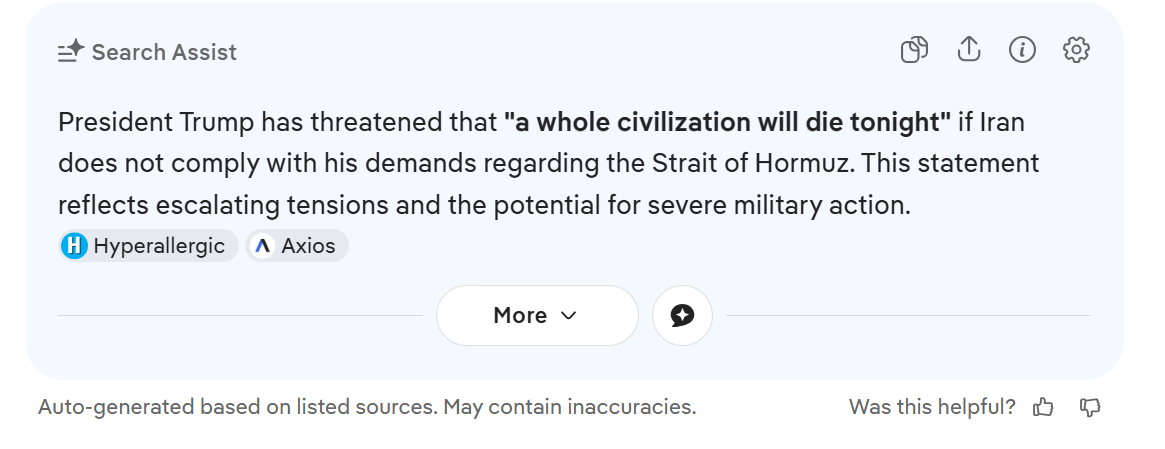 The auto-generated answer “may contain inaccuracies,” as the psychopathic monetizers of incoherence, fear and hatred — the masters of the universe — inform the users at the bottom of the partially accurate answer. The president’s statement reflects, it’s plain to see, “escalating tensions and the potential for severe military action.” AI does not reflect any kind of psychotic break from reality, not derangement, dementia, a desire to commit war crimes, an inability to back down, ever, stemming from childhood trauma and an overwhelming terror of more humiliation. “Escalating tensions.” you understand, between reality, which has a famously anti-Trump bias, in fact, hates and vilifies all Christian white men, and … the violently acted out prejudices of terrified, enraged white Christian men, as well as Mr. Trump himself.