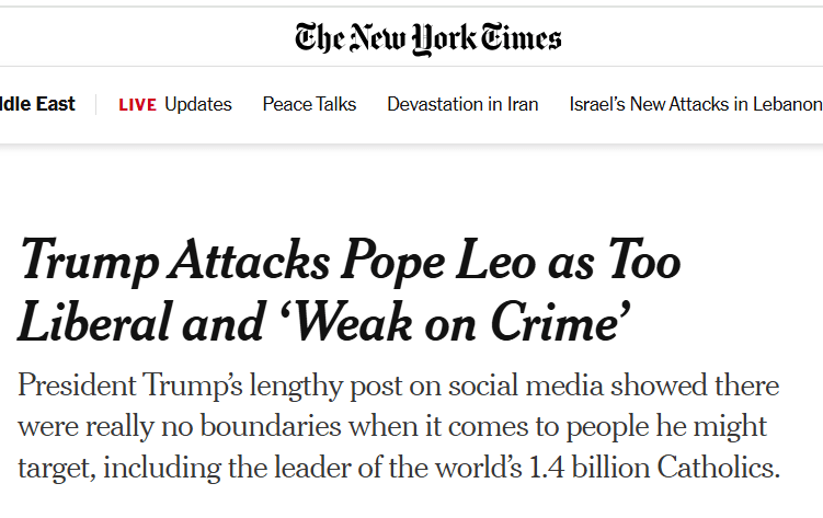 Trump tonight posted on social media, in part: “I don’t want a Pope who criticizes the President of the United States because I’m doing exactly what I was elected, IN A LANDSLIDE, to do, setting Record Low Numbers in Crime, and creating the Greatest Stock Market in History.” Trump suggested the Pope was elevated to the papacy only “because he was an American, and they thought that would be the best way to deal with President Donald J. Trump. If I wasn’t in the White House, Leo wouldn’t be in the Vatican.” He wrote “Leo should get his act together as Pope, use Common Sense, stop catering to the Radical Left, and focus on being a Great Pope, not a Politician.”
