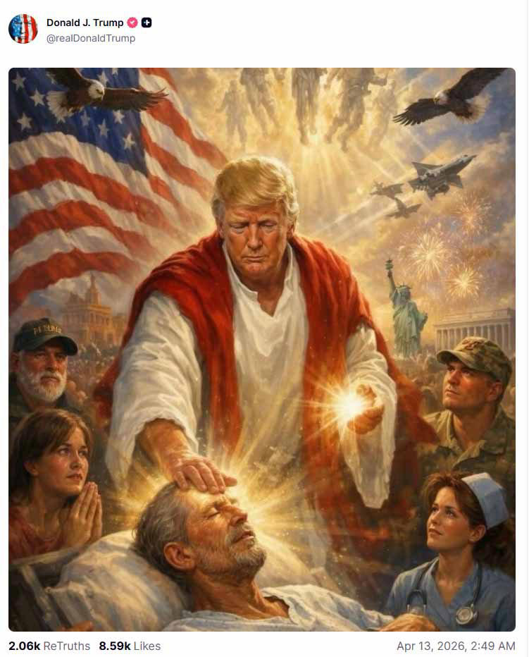 Today is Orthodox Easter, and about 45 minutes after attacking the Pope, Trump posted an image of himself in the place of Jesus, apparently healing a sick man in a bed, surrounded by a soldier, a nurse, a woman praying, and an older man. Behind him are the Statue of Liberty, the Lincoln Memorial, and a giant American flag, while in the sky are two eagles, three fighter jets, soldiers, and what seems to be a monster.