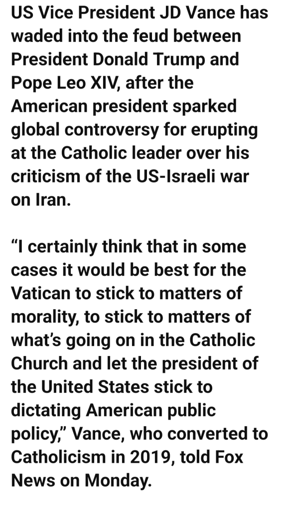 As every American school child knows, morality is not the concern of the American president. The president’s job is not to model or otherwise influence good or bad behavior, it is to dictate American public policy. Which makes him… a dictator? Hey, the pope was good with Mussolini and Hitler, he signed a peace treaty with them, why not the American version? Perhaps JD ought to pray on that, to God, not Peter Theil, before he opens his vapid mouth.