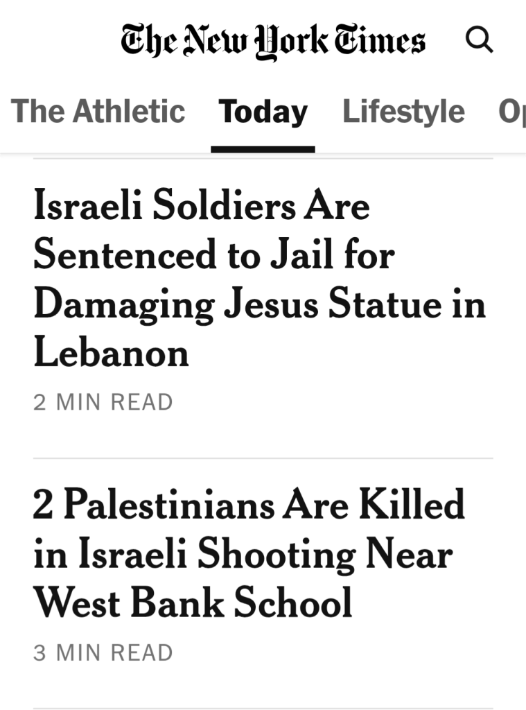 Damaging a statue of Jesus while depopulating southern Lebanon will not be tolerated by the world’s most moral army, the army of the sole democracy in the region, America’s beloved ally. It makes Israeli soldiers look anti-Christian, which is not a good look for an army of Jews supported by faithful. well-funded Christian Zionists. Depopulating southern Lebanon is a different matter entirely, as is the killing of aid workers coming to the aid of the injured, murdered and buried, along with their ambulance, by an Israeli bulldozer.