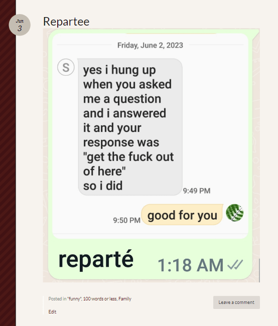 It was very clear from your moralistic response that you follow that interpretation, only one party has behaved aggressively and immaturely (from my point of view, I am not that party, of course – and I have the receipts, if anyone who has judged me unworthy of friendship were interested in being fair, or empathetic).