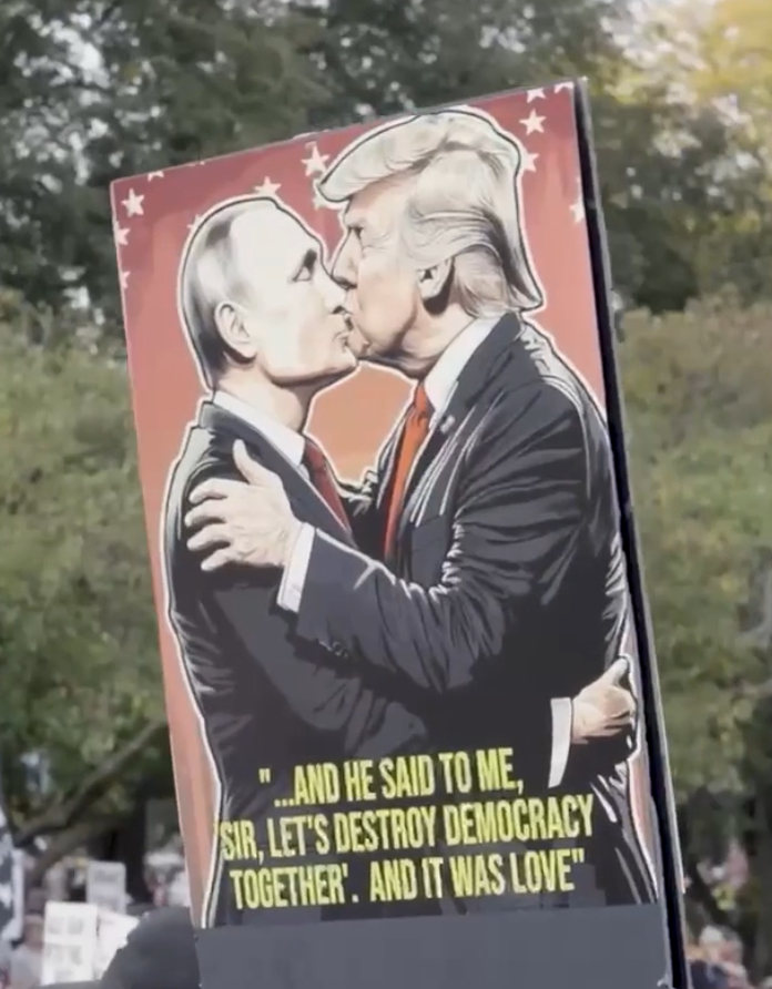 George Soros distributed all these signs to the 7,000,000 Americans who turned out for the second No King’s Day today, setting a record for the largest national protest in the US (all paid for by one guy). Oddly, not one demonstration-related arrest was reported in New York City, war torn Portland, Washington D.C. etc., in spite of all the MAGA hype about No Kings being a Hamas, Antifa, violent criminal Hate America rally.