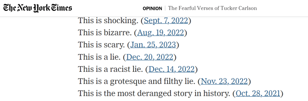 Tucker Carlson’s nightly YouTube clip headlines, formed into a poem by a clever chap named Hart Seely: