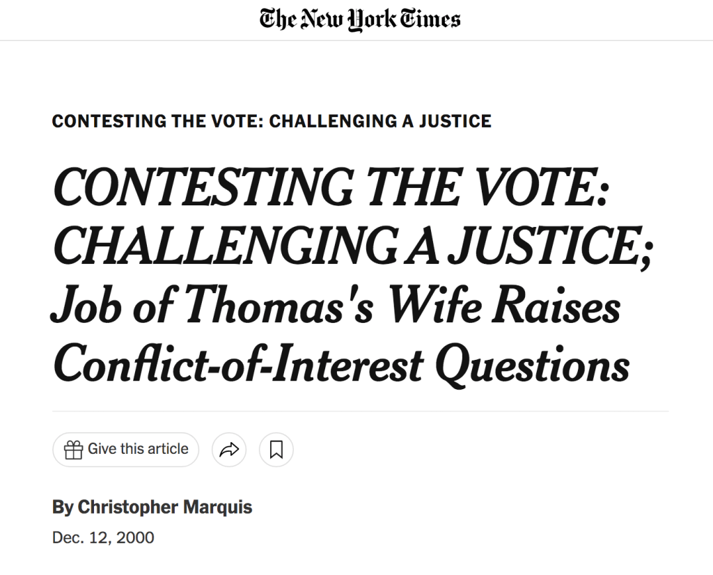 Here is a December 12, 2000 New York Times article about the appearance of impropriety in Thomas not recusing himself from Bush v. Gore. This “kerfuffle” with his influential extremist wife is certainly nothing new.