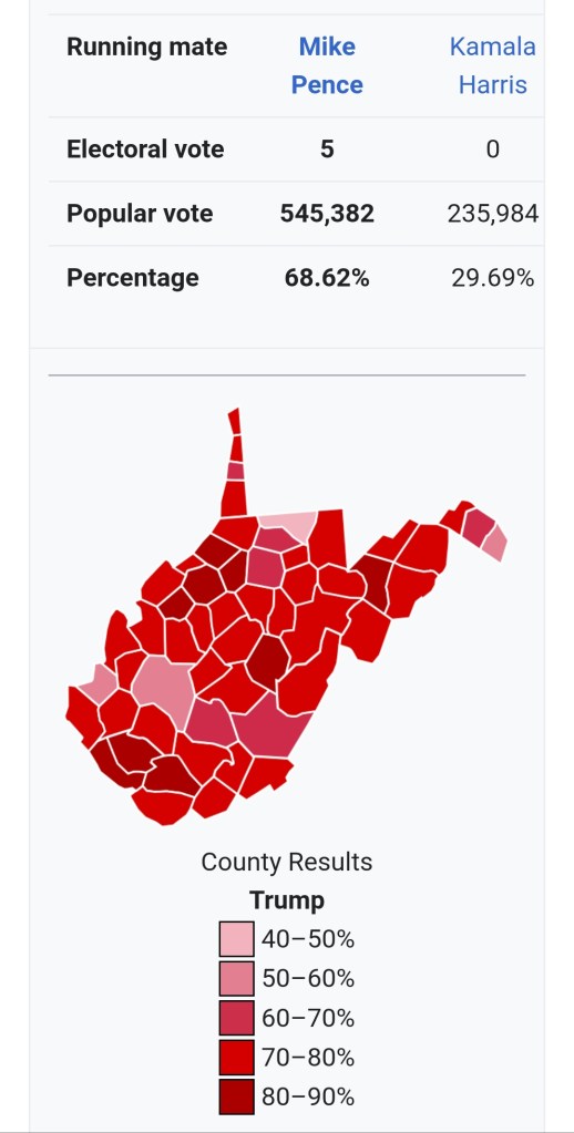 A decisive ass-whupping from a state where Trump had promised crowds of cheering West Virginians he’d send them back into the coal mines. Thousands of mining jobs were lost under Trump, a man with a spotty record on telling the truth, but MAGA man is apparently still beloved in West Virginia, at least among the 63% who turned out to vote in 2020. It’s clear, in light of the heavy Republican tilt of the great state of West Virginia, that Joe Manchin has to be mindful of the likelihood of being lynched if he calls too loudly for helping an illegitimate Democrat [sic] president by making it harder for obstructionists to filibuster every one of his proposed laws.
