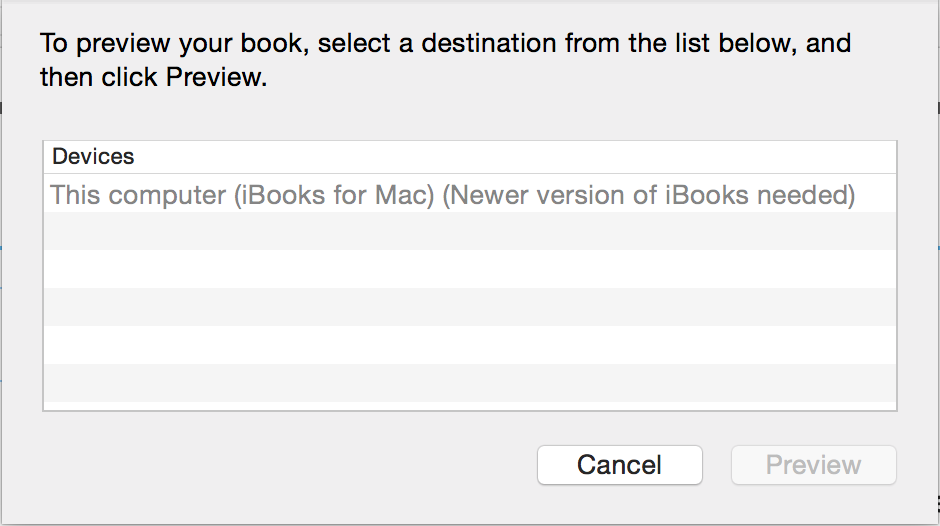 Happily there is a button that says Preview right at the top. I clicked it. I was invited to select a destination from a greyed out list that contained one destination. That destination, which I could not select, reads: This computer (iBooks for Mac) (Newer version of iBooks needed).
