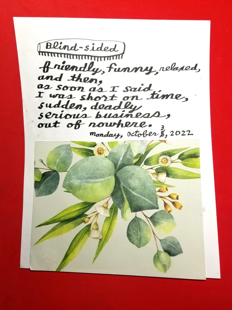 A couple you always thought of as your closest friends, a friendship you never questioned, are acting oddly distant to each other during a vacation in a beautiful rented house. After a few days, tensions are turned on you and one of them rages at you, glaring with a laser beam of hostility for long minutes, in a display of anger you haven’t seen since your father was alive. You endure a sleepless night after a door is angrily closed.