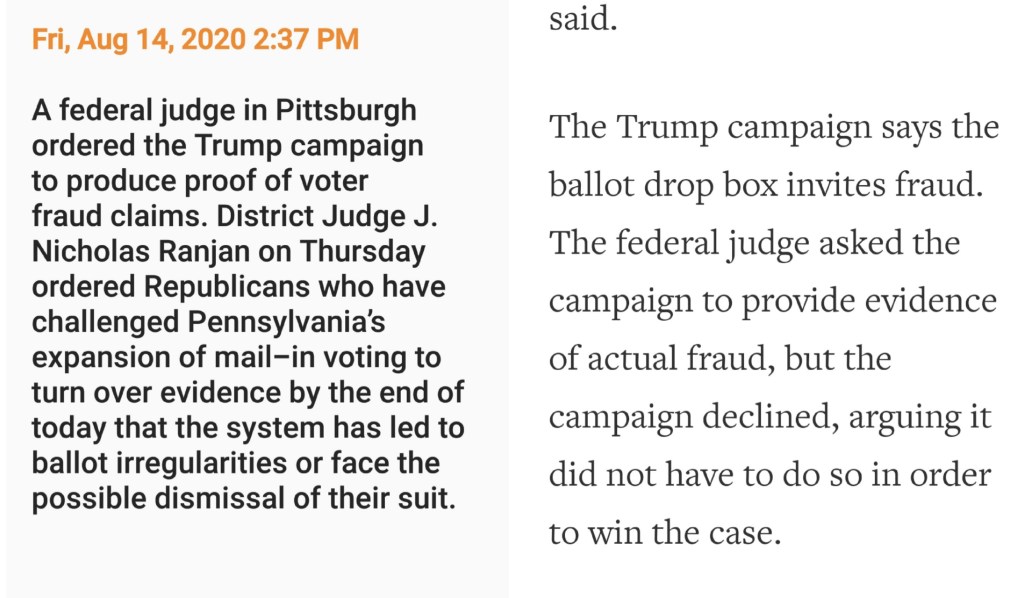 You can read the record of the 1 win 63 loss GOP post-election lawsuits, if you’d like to know if Paul is correct about the need for a commission to re-examine the many, many frauds that led to the “election” of this Commie-puppet Biden. The baseless Texas AG’s hail-Mary attempt to get the Supreme Court to hear a case about the unfairness of anti-Trump votes in other states was thrown out for lack of standing, true enough. But I’d refer Rand Paul to one of the many opinions, written by Trump-appointed judges like J. Nicholas Ranjan, dissecting with great precision the evidence-free, feverishly stated fraud claims in state after state.(More details from Judge Ranjan’s scathing pre-election dismissal of the GOP federal case in Pennsylvania here).