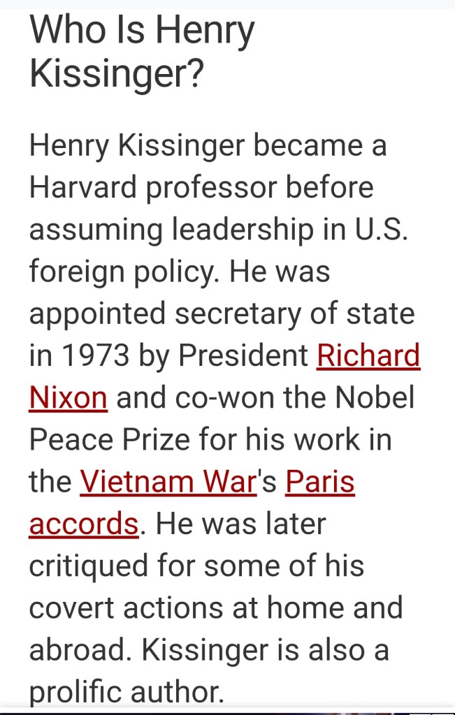 He indisputably won a Nobel Peace Prize for ending the war (his Vietnamese counterpart didn’t accept his own bullshit Peace Prize, knowing the true facts behind Kissinger’s mass murdering treachery). Biography.com takes no position on whether this critique of Kissinger is fair or not, we merely mention it out of a sense of fairness since so many seem to believe that the mass killings in Asia that he was deeply involved in was an American war crime.