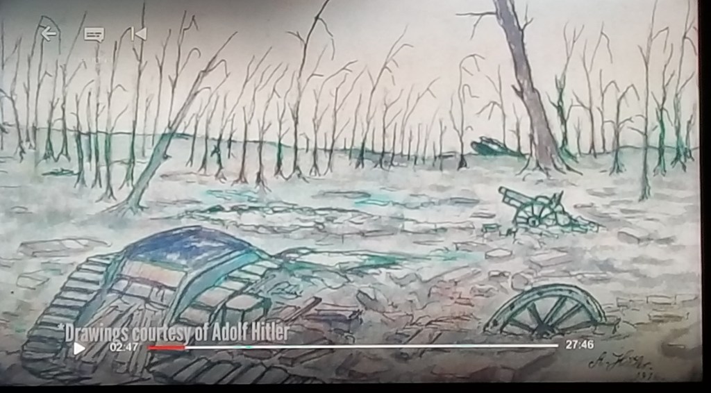I’d always heard Hitler was a “failed artist” before he found his calling in German politics. This label always irked me, as I myself am a “failed artist” (though my army of fanatical followers does not begin to compare to Mr. H’s) since I stubbornly failed to monetize my talents in any way. I’ve seen few of Hitler’s art works over the years but here is one that, like Trump’s American Carnage speech (Blacks and the Socialist Left have reduced our cities to raging anarchist war zones), perfectly reveals the artist’s weltanshauung, his view of the world as a grim, scorched, treacherous battlefield for eternal struggle, a worldview that would inspire millions: