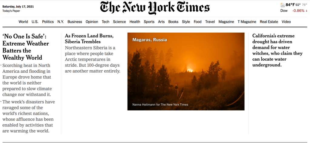 These three stories were at the top of Saturday’s NY Times. The wealthy world is now also officially at risk from extreme weather, the Arctic is on fire and there is, we learn, a great demand for “water witches” who can locate ground water by divination.