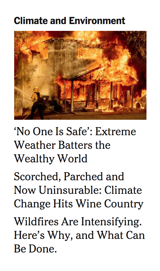 Check these three headlines out, from further down the NY Times home page, with the photo calculated to cause terror (the first is a repeat, about the wealthy also being in danger from climate catastrophe), making a big deal about natural occurrences that God Himself has caused: