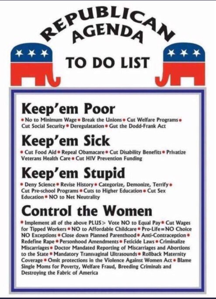 I don’t recall where I saw this, so I can’t give credit or link you to its source, but I have to commend whoever put it together for providing a hard to refute synopsis of the GOP platform, with just a couple of omissions — taxing vast wealth is a sin against Jesus Christ Himself, Climate Catastrophe, like Fauci-Ouchi’s totally fake COVID-19 HOAX, is a Communist false flag operation designed to kill the JOB CREATORS and give a pretext for freedom haters from the tyrannical federal government to go door to door castrating the population.