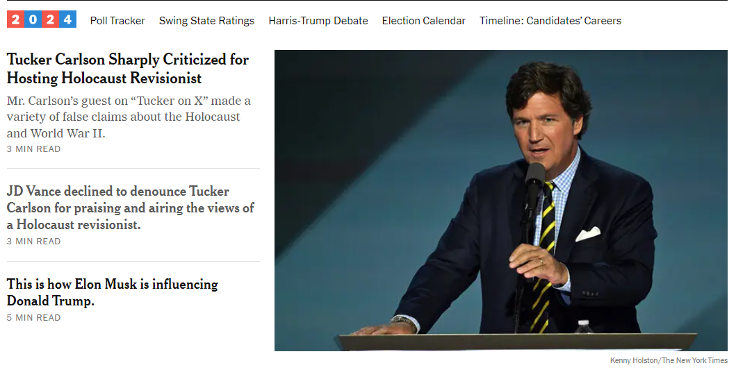 . . . Cooper proceeded, in a soft-spoken, faux-reasonable way, to lay out an alternative history in which Hitler tried mightily to avoid war with Western Europe, Churchill was a “psychopath” propped up by Zionist interests, and millions of people in concentration camps “ended up dead” because the overwhelmed Nazis didn’t have the resources to care for them. Elon Musk promoted the conversation as “very interesting” on his platform X, though he later deleted the tweet.